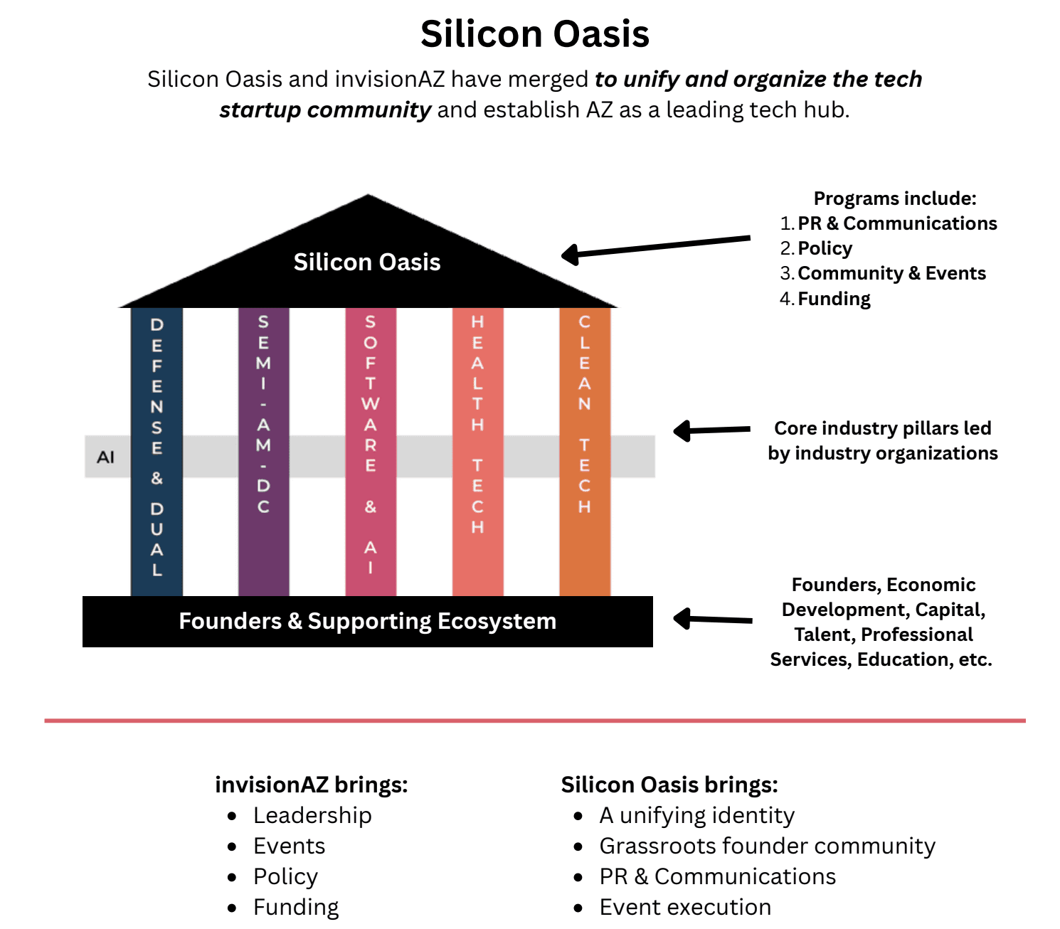 Silicon Oasis has emerged as a grassroots, founder-led movement built from within Arizona’s startup community, focused on connecting builders, operators, and investors through media, events, and direct engagement. In contrast, InvisionAZ has played a critical role in advancing statewide policy, economic development, and large-scale ecosystem initiatives. Together, the organizations bring both bottom-up community energy and top-down strategic influence, creating a more complete and coordinated platform to support Arizona’s innovation economy.